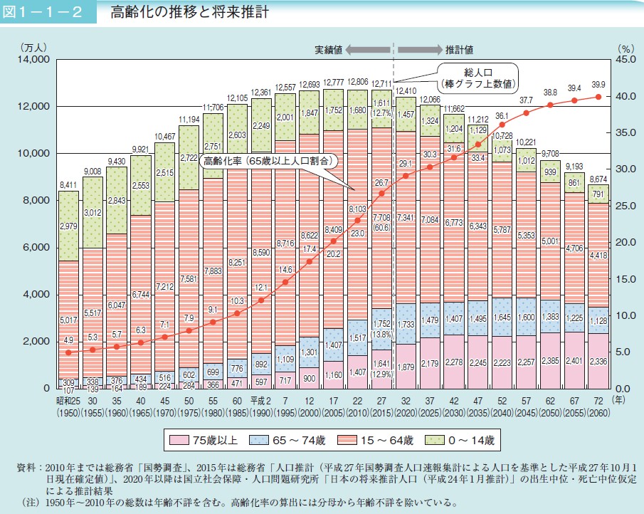発表が今年5月でしたので、ちょっと遅まきながら、毎年楽しませてくれる内閣府の「高齢社会白書(平成28年度版)」の話題をかいつまんで少しだけ。