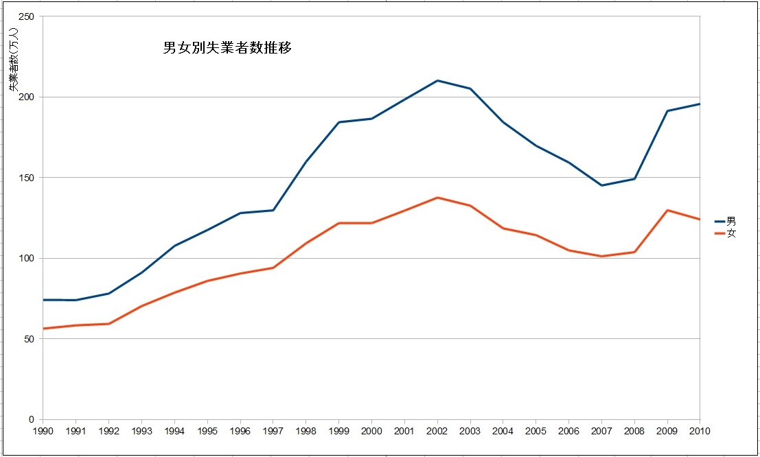 特に2009年までは男女ともほぼ同じ傾向を示していますが、2010年は男女が反対(男性の失業者が増え、女性は減る)に動くという、過去には例がない異常な状況を示しています。