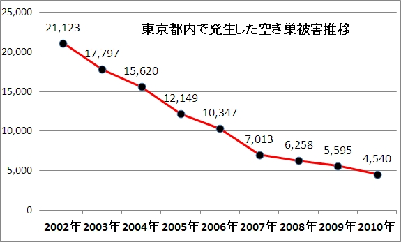 昨年2010年に東京都内で起きた空き巣は4,540件で、8年前の2002年と比べるとおよそ1/5に下がってきています。