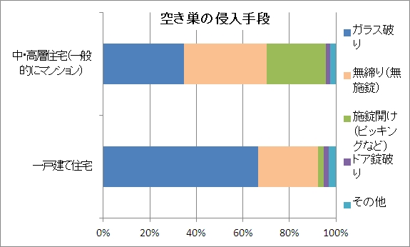 「一戸建て住宅」では「ガラス破り」が67%、次が「無締り」(無施錠)が26%で、この二つだけで侵入手段の9割以上を占めます。「中・高層住宅」(一般的にマンション)では「無締り」が36%、「ガラス破り」が35%、「施錠開け」(ピッキング行為)26%と大きくこの三つに分かれます。ピッキングで鍵を開ける手口はマンションの特権のようです。