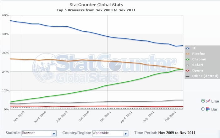 上記(StatCounter)のグラフを見ると、IEもFirefoxのシェアは徐々に落ちてきているのに対し、Google Chrome(クローム)が伸ばしてきています。すでにFirefoxを捉えて追い抜いたと先般報道がありましたが、今後もその傾向が続くのかどうかはわかりません。Firefox陣営も黙って見ていないでしょうから。