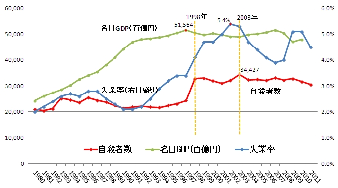 1999年は失業率が4.1から4.7%と0.6ポイントも急増し、名目GDPが1%下がりましたが、自殺者は横ばい(0.5%の微増)です。2003年は失業率が前年から0.1ポイント下がったにも関わらず名目GDPも下がってしまいました。そして自殺者数は前年から7ポイントも一気に急増することになります。