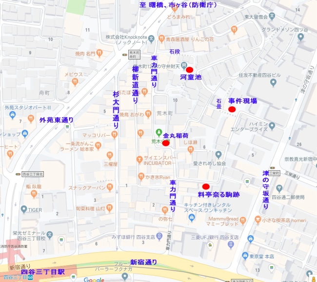 荒木町の全体図です。最寄り駅は地下鉄丸ノ内線四谷三丁目。