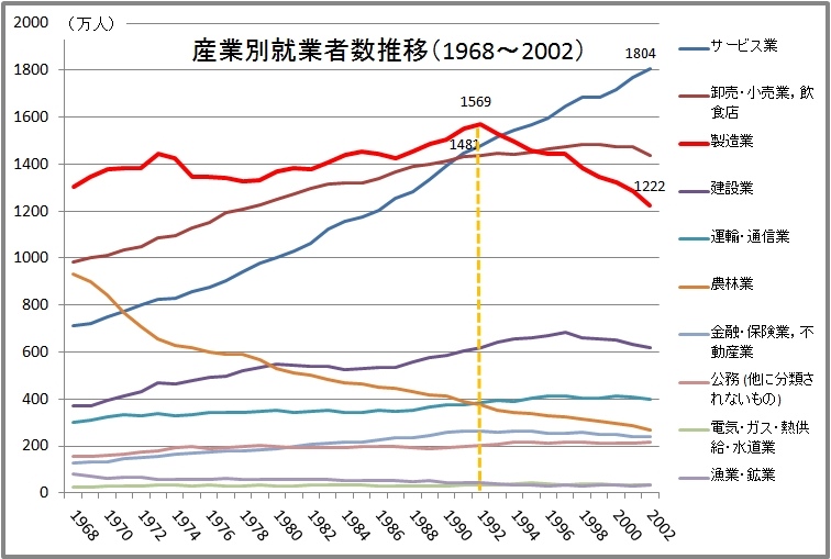 まず第一に、上記産業別就業者推移グラフを見ると、製造業、農林業の労働者は大きく減少していますが、「サービス業」が大きく増加しています。1992年と2002年の10年間で323万人も増加しています。産業間の労働者の移動のまずひとつめとしてそれが見て取れます。