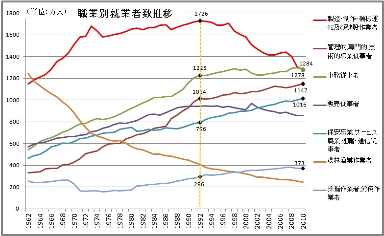 「製造・制作・機械運転及び建設作業者」がもっとも多かったのが1992年の1,726万人でした。それが18年後の2010年は1,278万人と448万人減っています。上記の産業別より就業者数が多いのは「建設作業者」が入っているからと推測できます。
