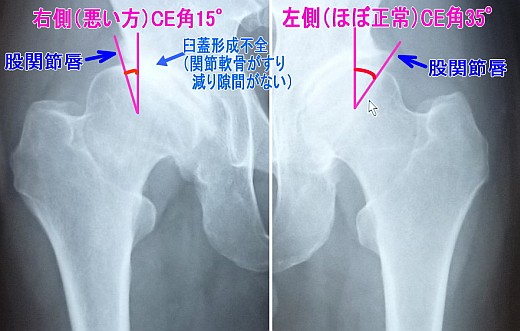 またCE角(Center-Edge Angle:大腿骨頭を臼蓋がどれぐらい覆っているかがわかる角度)が正常の場合は25°以上あるべきところ、15°しかありませんでした(左側のCE角は35°で正常)。
