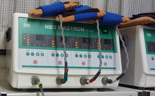 さらにリハビリ用の磁気加振式温熱治療器ネオマグトロン(NEO MAGTRON)を装着し、患部を15分間温めながら磁気と低周波振動を与えて終わりです。