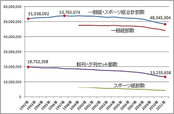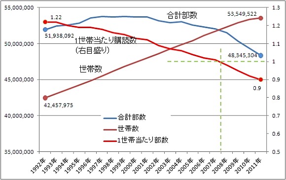 「2011年新聞・テレビ消滅」という本がありましたが、案の定タイトルだけのこけおどしに過ぎず、結局どこもつぶれずに立派に存続していますが、うちみたいな中年夫婦と子供三人の世帯でもその役割が終わりに近づいてきていると実感できるのですから、引退して暇を持てあます高齢者世帯以外では、家で新聞をとる習慣は相当に減っているのは間違いなさそうです。