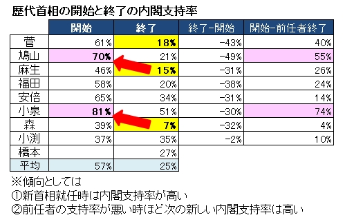 まず通例のこととして、首相が交代するとしばらくは期待感を込めて内閣支持率が大きく上がります。同時にその内閣の元になっている政党の支持率も一般的には引きずられて上がることになります。過去8人の新首相が作った最初の内閣支持率は平均すると57%で、首相交代直前の内閣支持率平均は25%と1/2以下に落ち込みます。