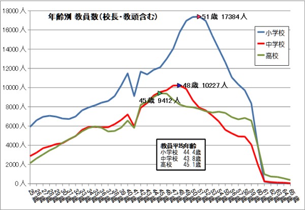 なぜこのような教員の高齢化が顕著になってきたかと言うと、ひとつには1970年代生まれの団塊ジュニア達の受け入れにあたり、1980年前後に大量に教員を増やしていったことに起因すると言われています。その1980年前後に22~3歳で大量に奉職した教員が2011年現在50歳代になってきているわけです。