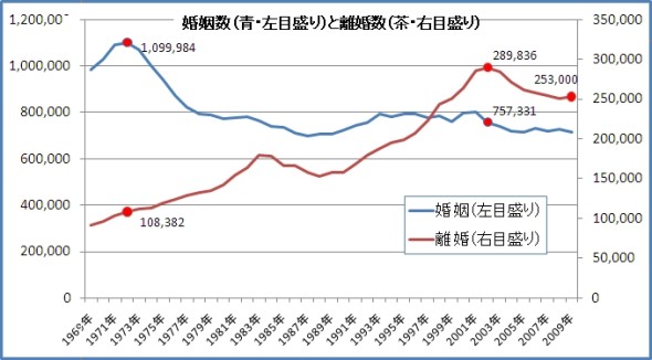 離婚率というのは一般的に人口千人あたり何件の離婚があるかを調べるので、団塊世代や団塊ジュニアなど突出した人口構成、少子化傾向などは考慮されません。件数で見るならばその母数の変化も考慮しなければ誤った見方になります。