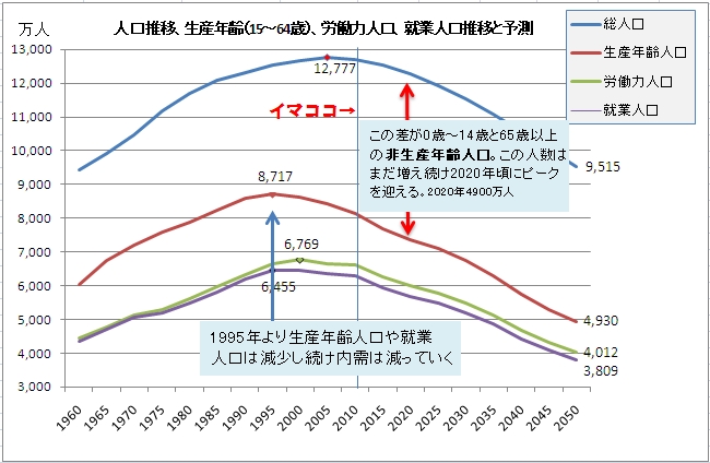 少子化と高齢化が同時に進み、1990年代半ばをピークに生産年齢人口が極端に減少し続けることによる内需の減少が進み、「失われた10年」が今では「失われた20年」となり、さらにそれが今後も30年、40年と続くのは明かなのです。今回の被災地からの報道で見る高齢者の多さにあらためて驚いた人も多いのではないでしょうか。あれは十数年後の首都圏の姿です。