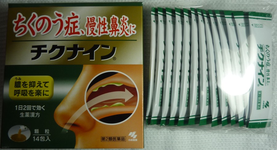 一生このナザールを手元に置いておかなければならないなと思っていましたが、今回最近新聞やテレビ広告で派手に宣伝を始めた小林製薬の「チクナイン」という漢方の飲み薬を初めて試してみました。朝と晩の2回服用しますが、1週間分(14包)で2000円と結構高価な薬です。